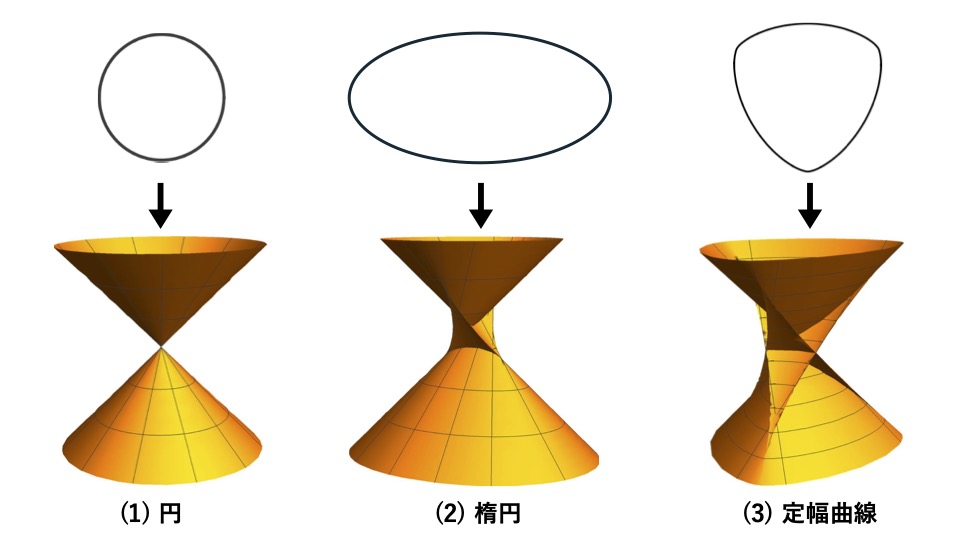 図2の(1)は円から作られているもので、(2)は楕円から、(3)は定幅曲線から作られています。定幅曲線とは、どの方向から測っても幅が一定の曲線です。円もこれに該当します。これらの曲面の大きな特徴としては、“曲線を用いて曲面の性質を調べられる”という点があります。図3について説明します。