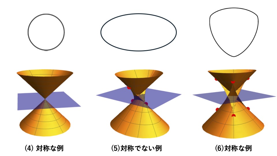 図3について、(4)と(6)は青い平面に関して対称ですが、(5)は対称ではありません。(4)と(6)は、定幅曲線から作られていましたが、(5)はそうではありませんでした。このように、曲線の性質が、曲面の対称性に反映されていることがわかります。